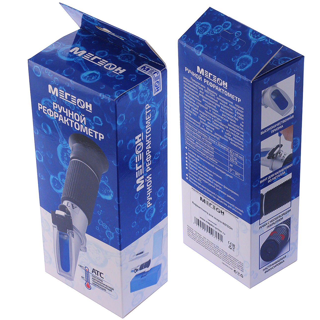 МЕГЕОН 72009 относится к оптическим измерительным приборам — рефрактометрам, которые предназначены для определения коэффициента преломления исследуемого вещества и проецировании отраженного света на специально отградуированный экран. Характеристики жидкости (концентрация, плотность и т.д.), устанавливаемые рефрактометром, определяют вид шкалы, нанесенной на экран. Для повышения точности предусмотрена система автоматической температурной коррекции (ATC), которая имеет широкий температурный диапазон работы. Для исследования достаточно нанести две- три капли на призму с градуировкой, закрыть прижимное стекло и настроить фокусировку. Не требуется источник питания, что даёт возможность производить измерения при низких температурах. Эргономичный корпус из алюминиевого сплава и простота эксплуатации максимально увеличивают срок службы изделия.